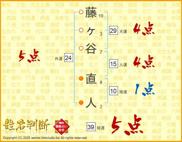 藤(19画)ヶ(3画)谷(7画) 直(8画)人(2画)