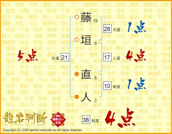 藤垣直人さんの総運は38画の4点!