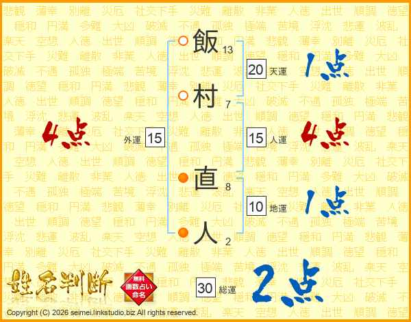 生活面を象徴する運勢です。外部から受ける影響力を表し、結婚運、家庭運や職場、環境への順応性を表します。総運から人運を引いた画数。姓や名が1文字の場合を除く。