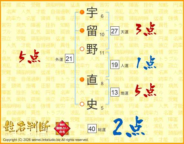 宇(6画)留(10画)野(11画) 直(8画)史(5画)