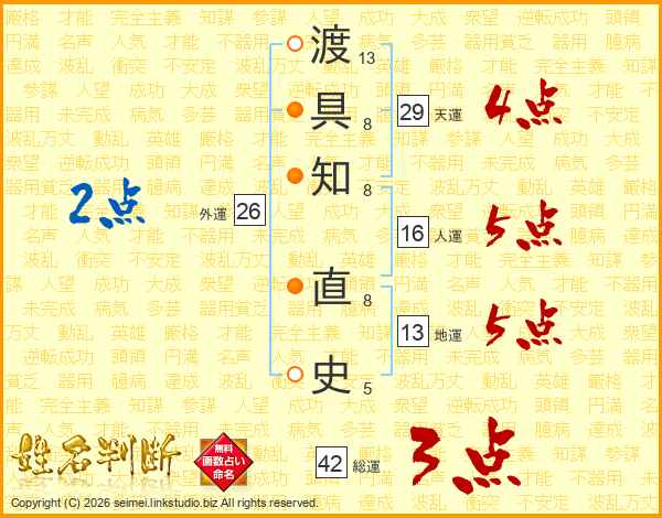 渡(13画)具(8画)知(8画) 直(8画)史(5画)