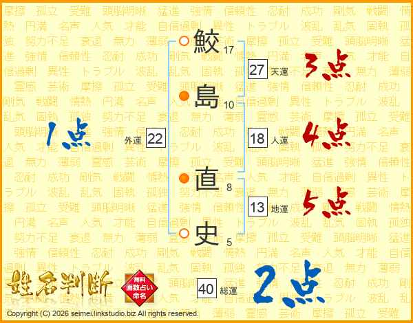 鮫(17画)島(10画) 直(8画)史(5画)