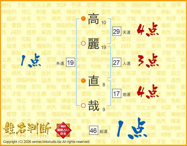 高(10画)麗(19画) 直(8画)哉(9画)