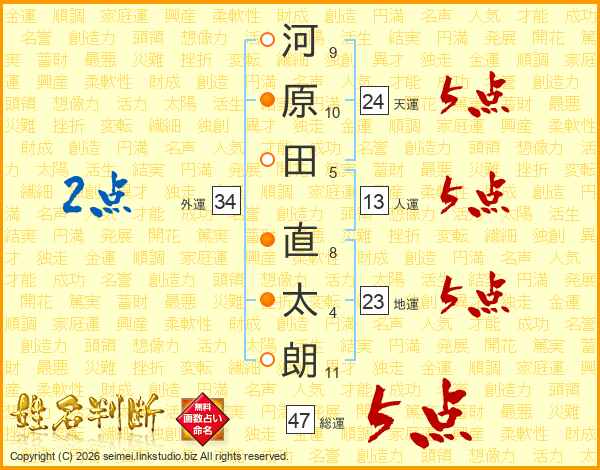 河(9画)原(10画)田(5画) 直(8画)太(4画)朗(11画)