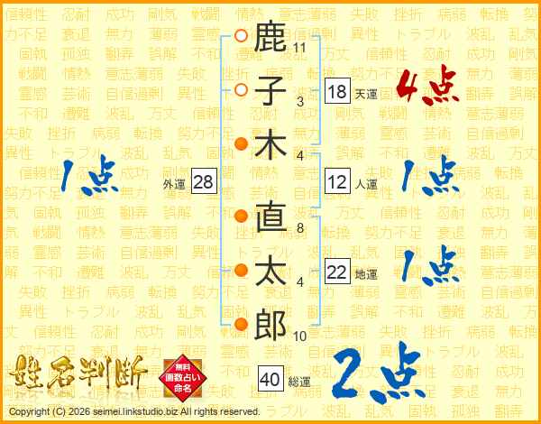 鹿(11画)子(3画)木(4画) 直(8画)太(4画)郎(10画)