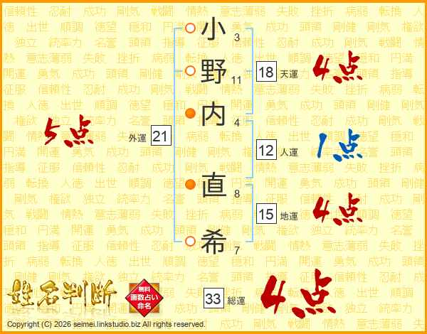 小(3画)野(11画)内(4画) 直(8画)希(7画)