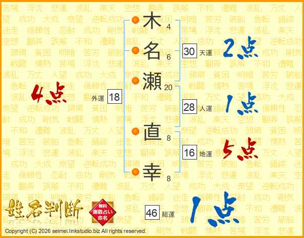 木(4画)名(6画)瀬(20画) 直(8画)幸(8画)