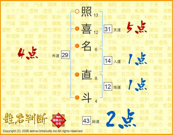 照(13画)喜(12画)名(6画) 直(8画)斗(4画)