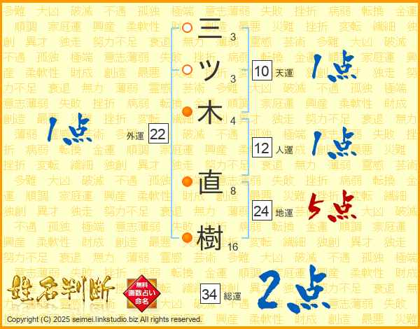 三(3画)ツ(3画)木(4画) 直(8画)樹(16画)