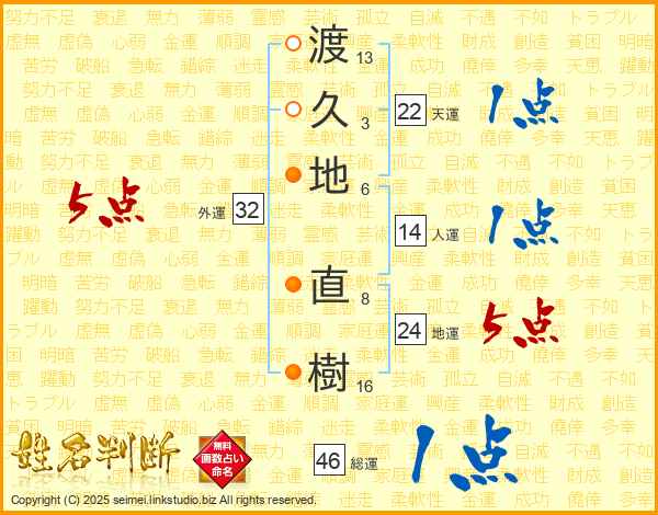 渡(13画)久(3画)地(6画) 直(8画)樹(16画)