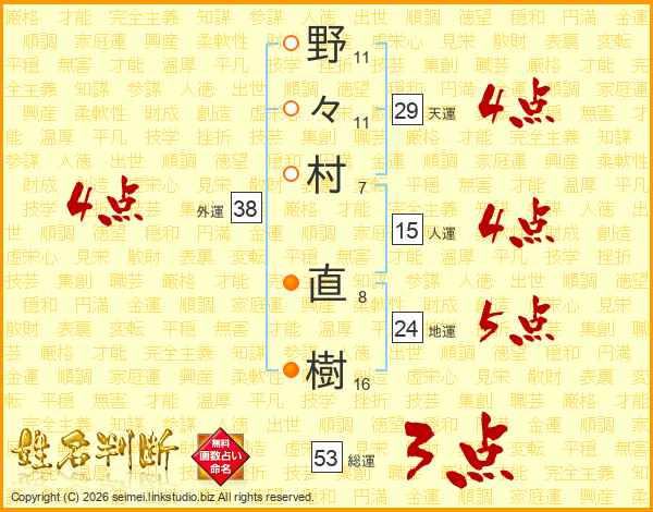 野(11画)々(11画)村(7画) 直(8画)樹(16画)