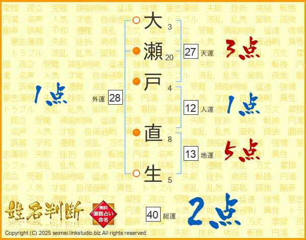 大(3画)瀬(20画)戸(4画) 直(8画)生(5画)