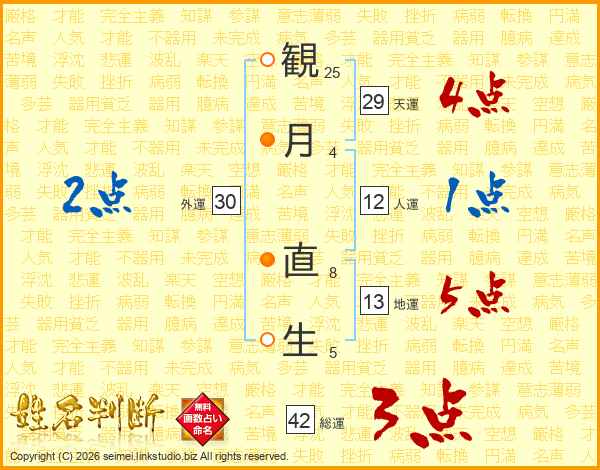 生活面を象徴する運勢です。外部から受ける影響力を表し、結婚運、家庭運や職場、環境への順応性を表します。総運から人運を引いた画数。姓や名が1文字の場合を除く。