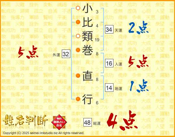 生活面を象徴する運勢です。外部から受ける影響力を表し、結婚運、家庭運や職場、環境への順応性を表します。総運から人運を引いた画数。姓や名が1文字の場合を除く。