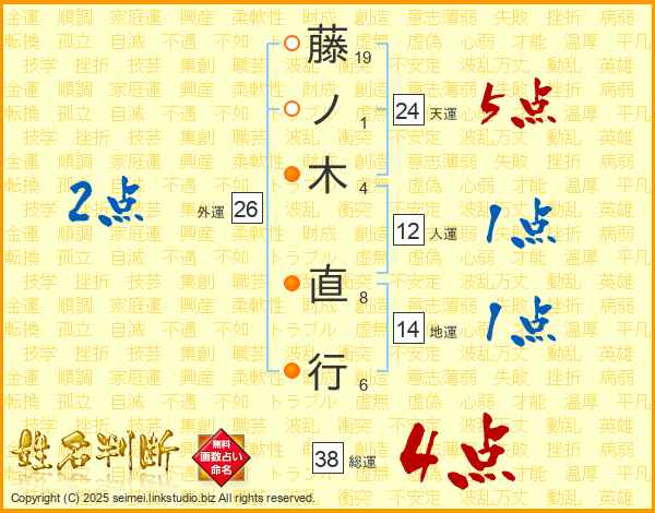 藤(19画)ノ(1画)木(4画) 直(8画)行(6画)