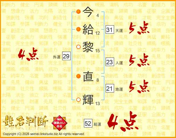 今(4画)給(12画)黎(15画) 直(8画)輝(13画)