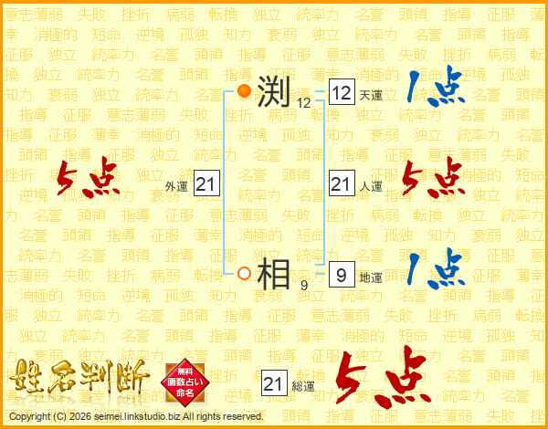 生活面を象徴する運勢です。外部から受ける影響力を表し、結婚運、家庭運や職場、環境への順応性を表します。総運から人運を引いた画数。姓や名が1文字の場合を除く。