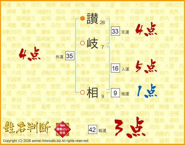 家系が持つ宿命的な運勢を表します。祖先から受け継いだ苗字ですので自分の力が及びません。家柄を象徴します。苗字の合計画数。