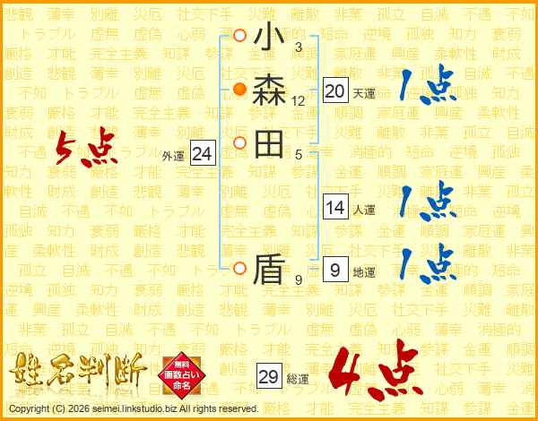 生活面を象徴する運勢です。外部から受ける影響力を表し、結婚運、家庭運や職場、環境への順応性を表します。総運から人運を引いた画数。姓や名が1文字の場合を除く。