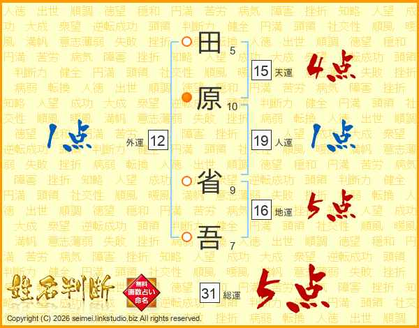 生活面を象徴する運勢です。外部から受ける影響力を表し、結婚運、家庭運や職場、環境への順応性を表します。総運から人運を引いた画数。姓や名が1文字の場合を除く。