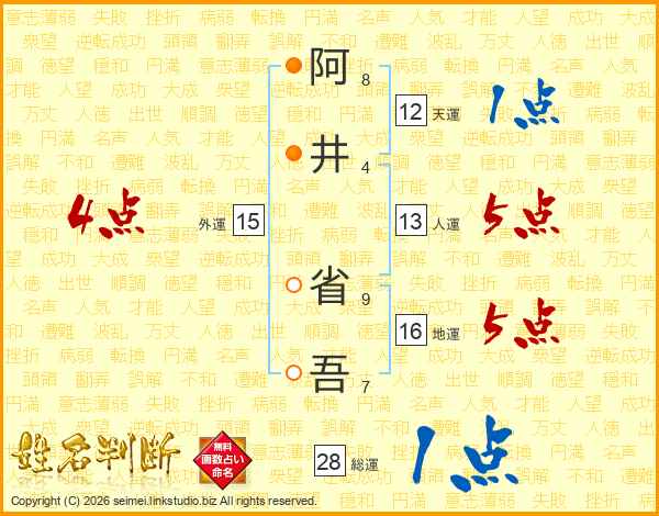 生活面を象徴する運勢です。外部から受ける影響力を表し、結婚運、家庭運や職場、環境への順応性を表します。総運から人運を引いた画数。姓や名が1文字の場合を除く。