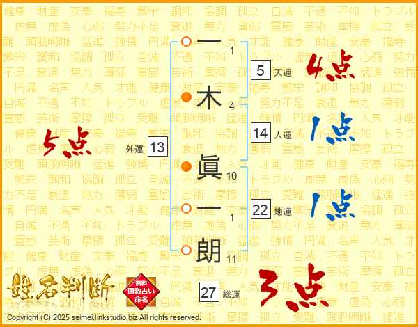 一(1画)木(4画) 眞(10画)一(1画)朗(11画)
