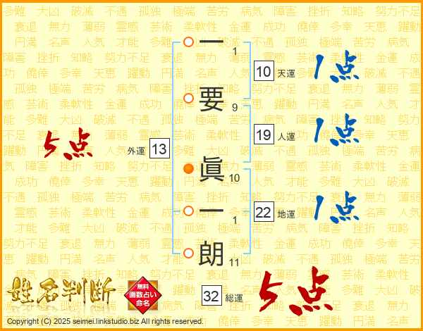 一(1画)要(9画) 眞(10画)一(1画)朗(11画)