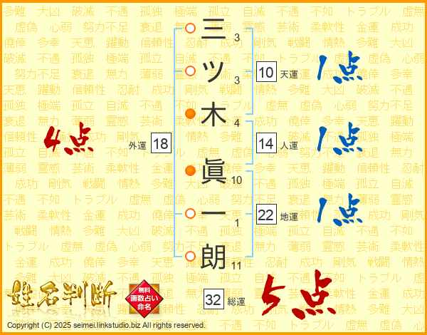 三(3画)ツ(3画)木(4画) 眞(10画)一(1画)朗(11画)