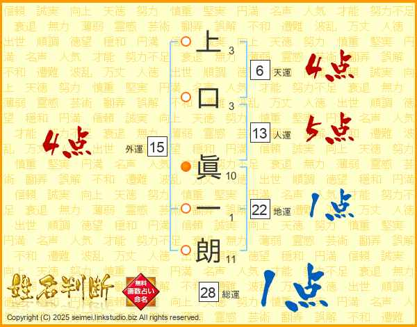上(3画)口(3画) 眞(10画)一(1画)朗(11画)