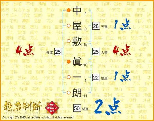 中(4画)屋(9画)敷(15画) 眞(10画)一(1画)朗(11画)