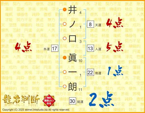 井(4画)ノ(1画)口(3画) 眞(10画)一(1画)朗(11画)