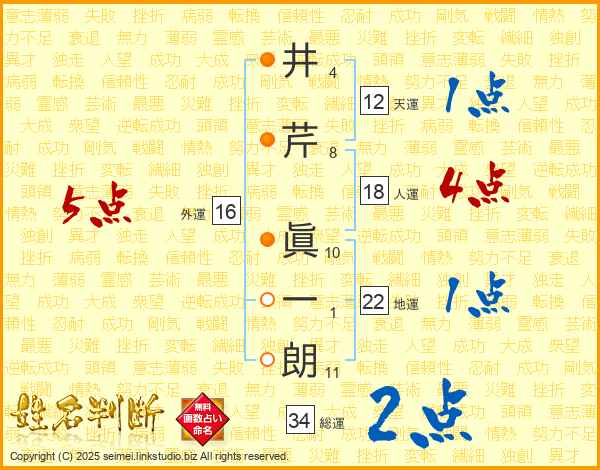 井(4画)芹(8画) 眞(10画)一(1画)朗(11画)
