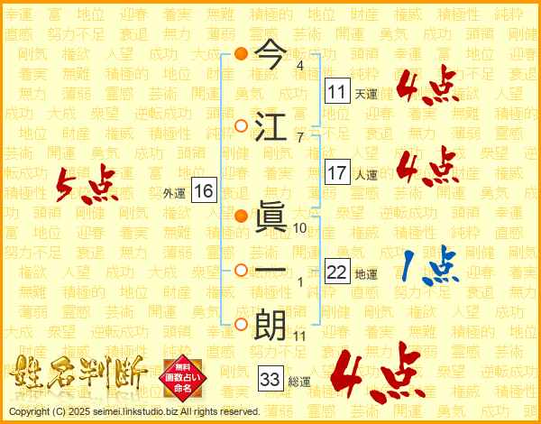 今(4画)江(7画) 眞(10画)一(1画)朗(11画)