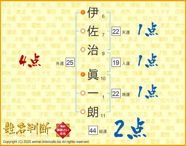 伊(6画)佐(7画)治(9画) 眞(10画)一(1画)朗(11画)