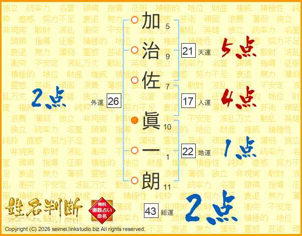 加(5画)治(9画)佐(7画) 眞(10画)一(1画)朗(11画)