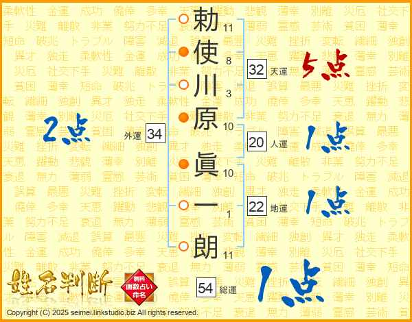 勅(11画)使(8画)川(3画)原(10画) 眞(10画)一(1画)朗(11画)
