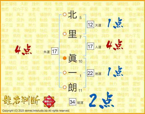 北(5画)里(7画) 眞(10画)一(1画)朗(11画)