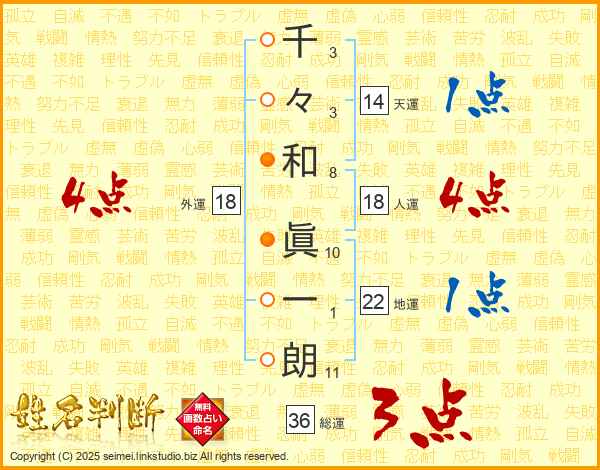 千(3画)々(3画)和(8画) 眞(10画)一(1画)朗(11画)