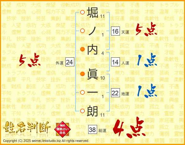 堀(11画)ノ(1画)内(4画) 眞(10画)一(1画)朗(11画)
