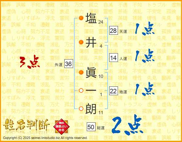 塩(24画)井(4画) 眞(10画)一(1画)朗(11画)