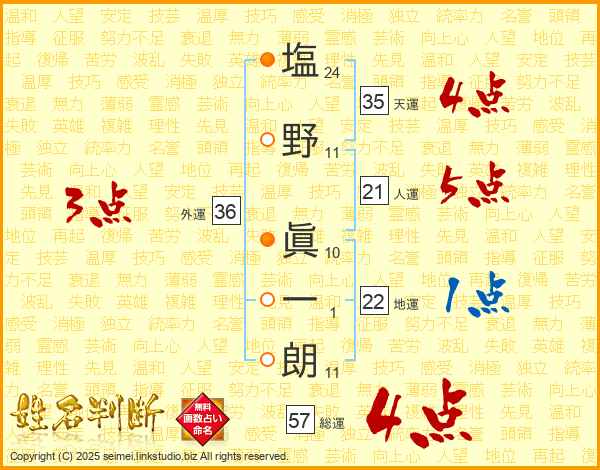 塩(24画)野(11画) 眞(10画)一(1画)朗(11画)