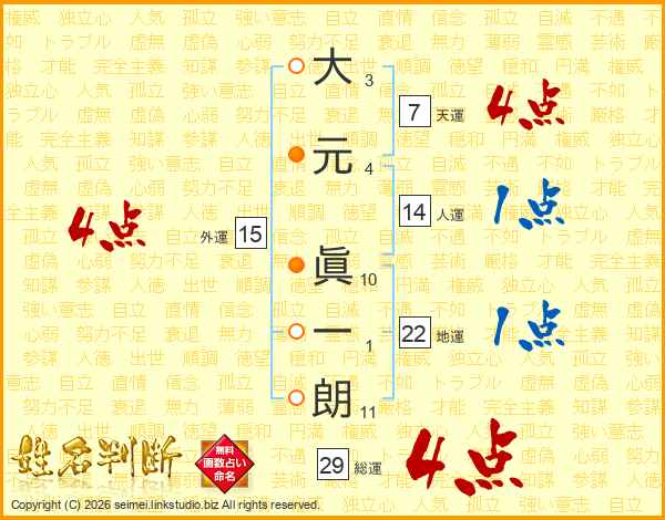 大元眞一朗さんの総運は29画の4点!