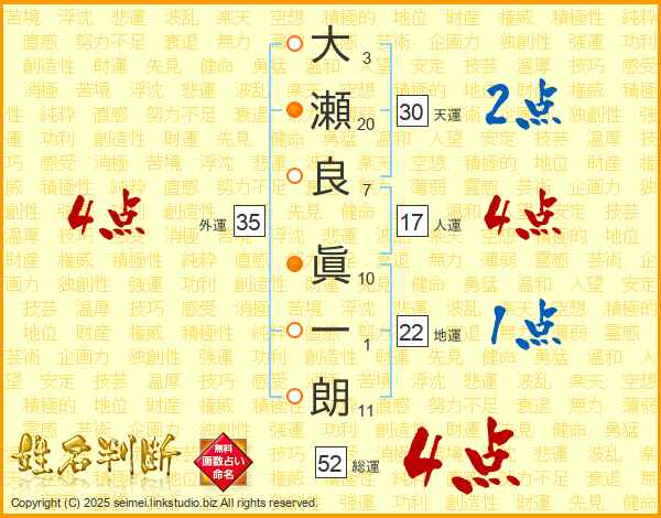 大(3画)瀬(20画)良(7画) 眞(10画)一(1画)朗(11画)