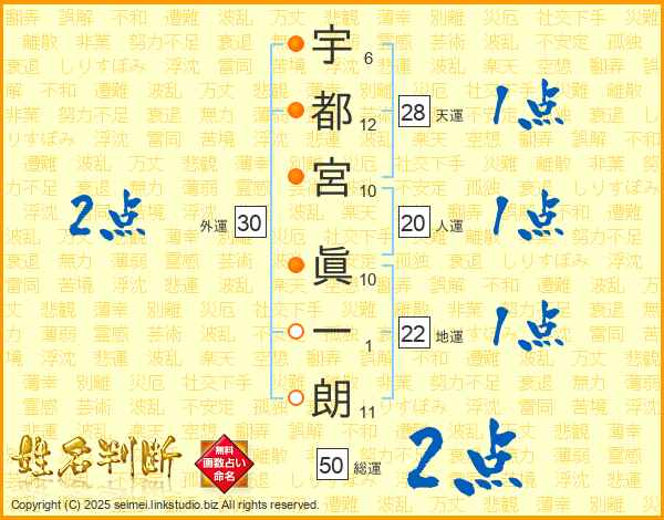 宇(6画)都(12画)宮(10画) 眞(10画)一(1画)朗(11画)