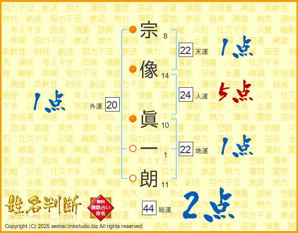 宗(8画)像(14画) 眞(10画)一(1画)朗(11画)