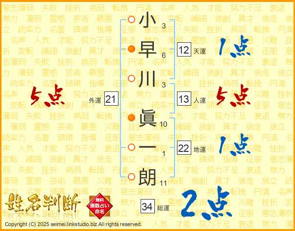 小(3画)早(6画)川(3画) 眞(10画)一(1画)朗(11画)