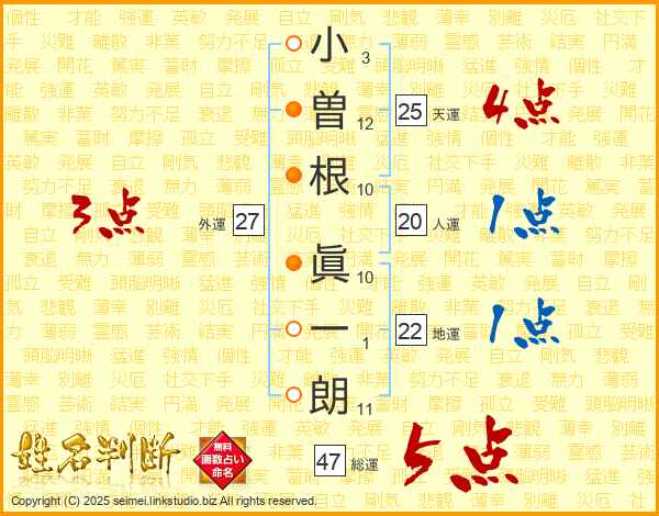 小(3画)曽(12画)根(10画) 眞(10画)一(1画)朗(11画)