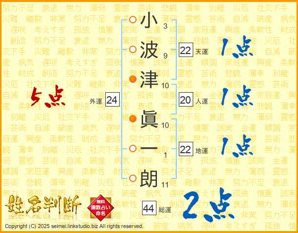 小(3画)波(9画)津(10画) 眞(10画)一(1画)朗(11画)