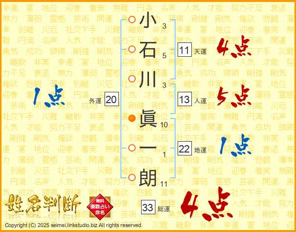 小(3画)石(5画)川(3画) 眞(10画)一(1画)朗(11画)