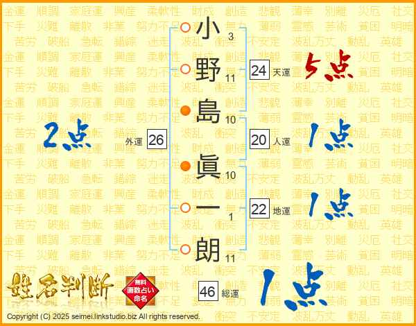 小(3画)野(11画)島(10画) 眞(10画)一(1画)朗(11画)